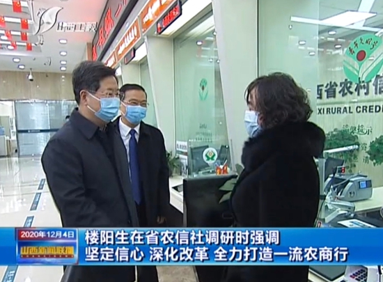 12月3日下午,省委书记楼阳生在省农信社调研,并主持召开座谈会。他强调,要深入学习贯彻党的十九届五中全会精神和习近平总书记视察山西重要讲话重要指示,不断深化地方金融机构改革,完善金融体系,强化金融监管,创优金融生态,为转型发展蹚新路提供有力金融支撑。 省领导罗清宇、李凤岐、王一新参加调研。