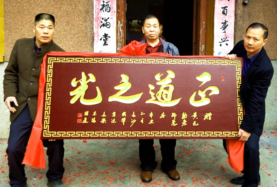 ▲图为湖南省宜章县玉溪镇罗家山村民肖光金、彭小青等人赠送给“中国民间反腐第一人”黄元勋的“正道之光”牌匾