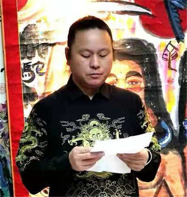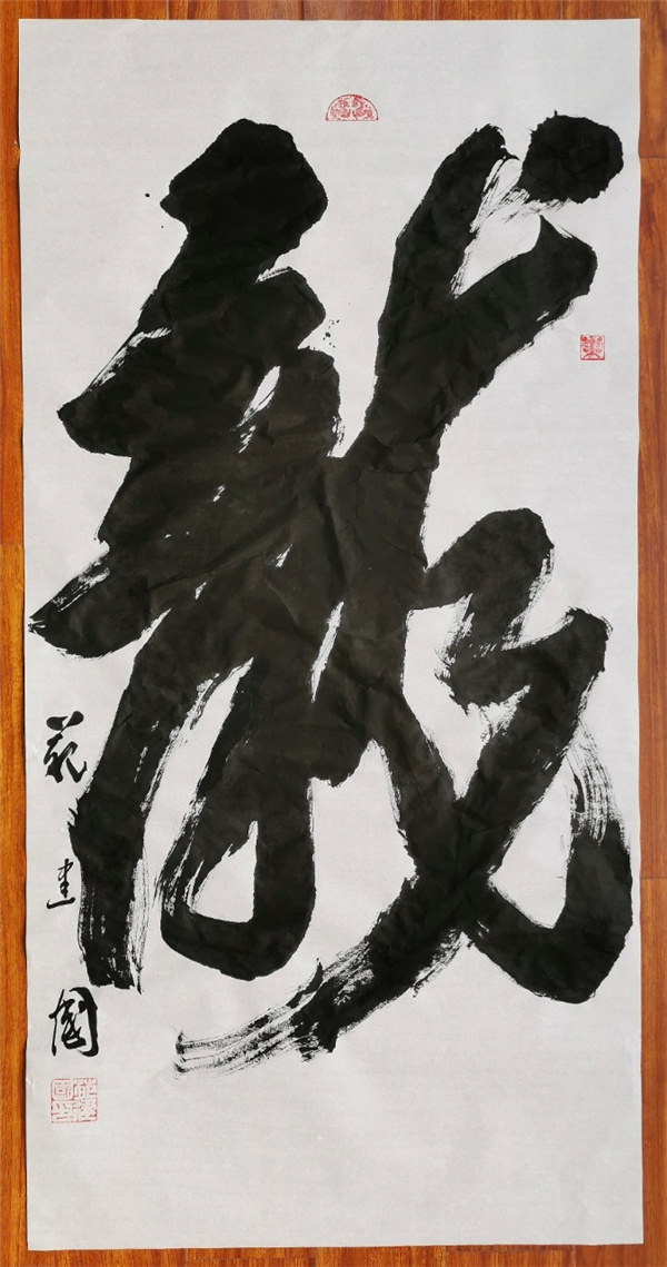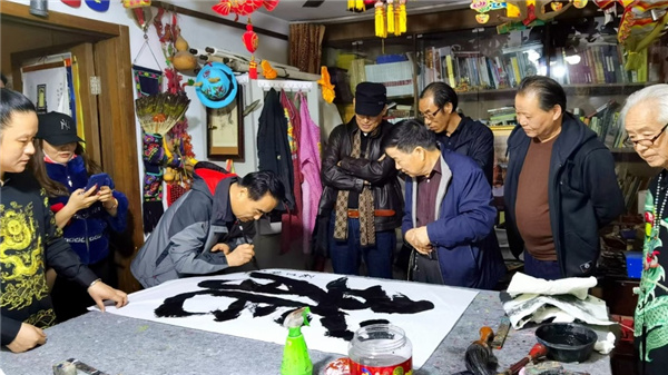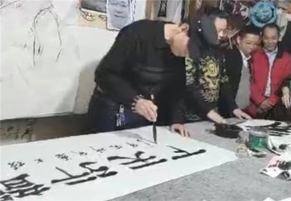 苑建国首先开笔,书写4尺整张榜书“龙”字。