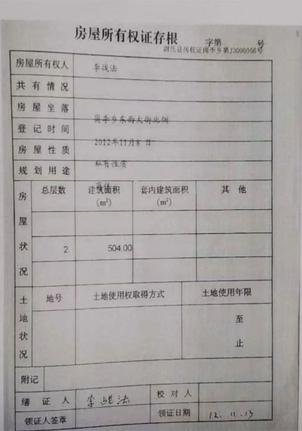 李战法当时向法院提交的房权证岗李乡字第J3000056号房产证也引起律师的质疑,因为碳素厂这块地根本就没有土地证,办理房屋产权登记是需要土地证的,当时我们怀疑李战法提交的房产证是假的,于是向法院申请调查令,到不动产登记中心查询,根据房产证号查不到该房产证,后来查询不动产登记档案查到了李战法办理房权证岗李乡字第J3000056号房产证的档案资料,档案里土地和规划资料都是空白,只标注了房屋坐落位置,建筑面积和规划用途,很明显这个房产证的办理程序存在违法行为,于是向法院提起行政诉讼要求撤销李战法的房产证,一开始尉氏县法院不给立案,律师多次沟通法院才立案。