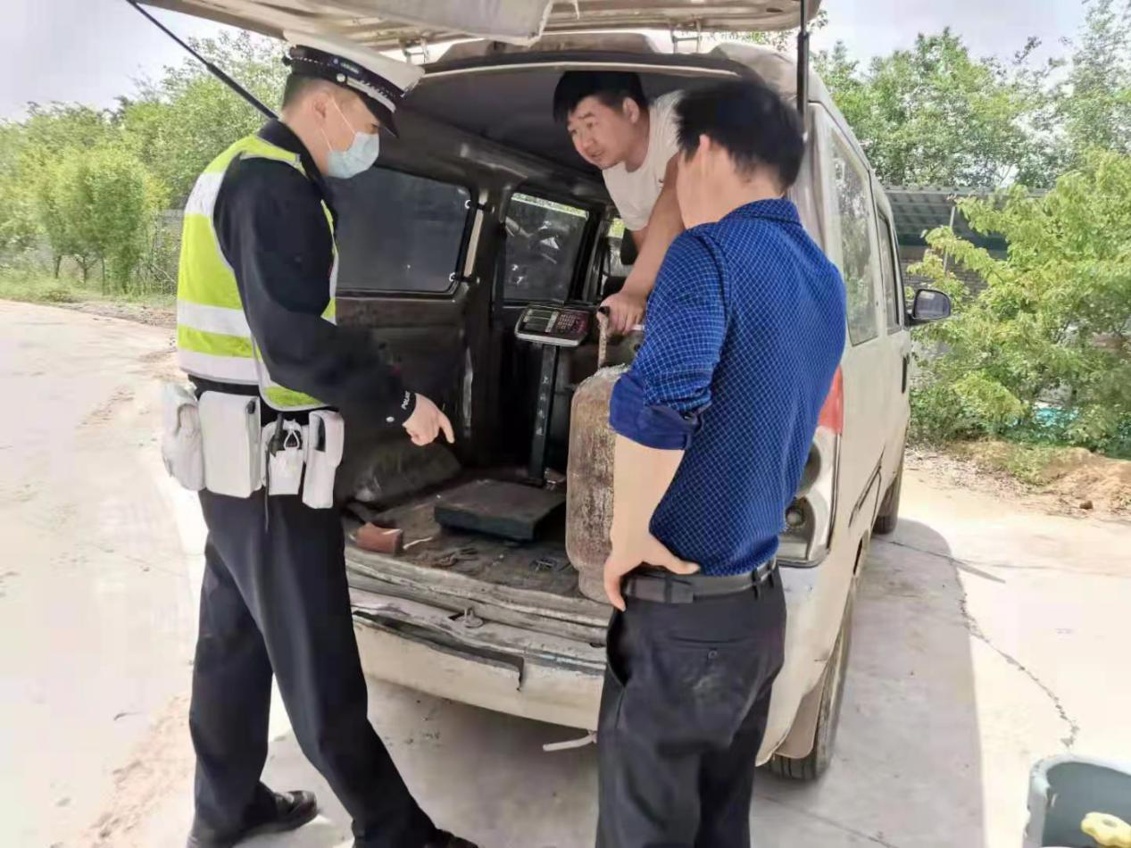 2021年4月28日11点30分许,五大队大队民警陈坤带领辅警在站口执勤时,发现一辆津字牌照面包车其后尾部下沉严重,拦截进行安全检查时,发现该面包车后座全部拆除,面包车内拉有十余个液化气罐,且有部分液化气罐还有液化气。