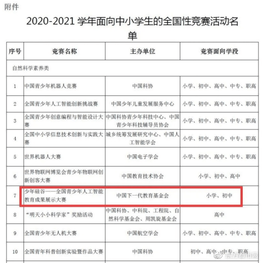 教育部白名单竞赛,致力提升青少年科技素养据悉,少年硅谷全国青少年人工智能教育成果展示大赛是教育部白名单的自然科学素养类赛事之一,由中国下一代教育基金会主办,旨在通过富有挑战性、科技性、创新性和趣味性的公益性比赛,展示青少年人工智能教育成果,培养新时代科技人才。