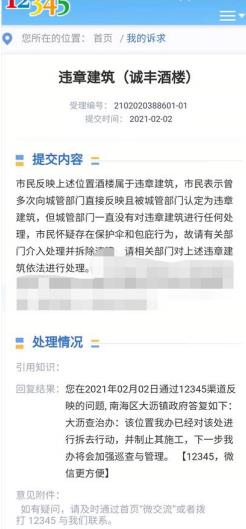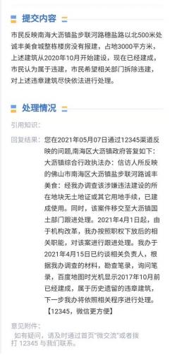 2021 年前半年,佛山人民群众向佛山市人民政府 12345 进行 6 次投诉,相关部门一边答复采取拆除行动,一边拖延,至今未拆除。