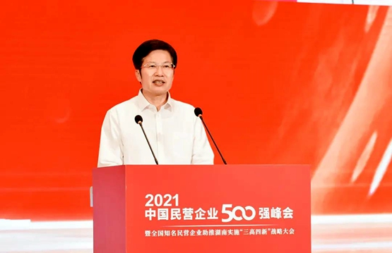 9月25日,由全国工商联、湖南省人民政府共同主办的2021中国民营企业500强峰会暨全国知名民营企业助推湖南实施“三高四新”战略大会在长沙举行。全国政协副主席、全国工商联主席高云龙,中共湖南省委书记、省人大常委会主任许达哲出席并分别致辞。中央统战部副部长、全国工商联党组书记、常务副主席徐乐江,省委副书记、省长毛伟明,省政协主席李微微,重庆市原市长黄奇帆出席。工信部副部长徐晓兰,国家乡村振兴局副局长洪天云,中国工商银行副行长张伟武,中国建设银行副行长王浩分别致辞。全国工商联党组副书记、副主席樊友山主持。全国政协副秘书长、全国工商联副主席黄荣,安徽省副省长王翠凤,贵州省政协副主席李汉宇,省领导黄兰香、谢建辉、张剑飞、吴桂英、黄关春、张健等出席。中国光彩事业促进会理事、湖南省工商联(总商会)副会长、绿之韵集团董事长胡国安受邀参会。
