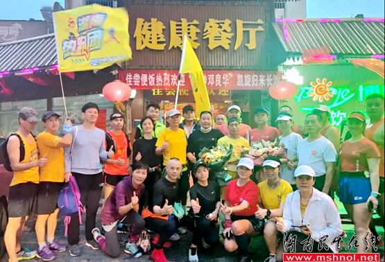 ▲邓良华与湘军跑团、湖南热跑团、年嘉湖三点跑团的跑友们跑到佳尝便饭健康餐厅前合影