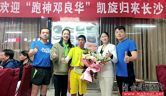 ▲ 长沙市安化商会副会长王心亮率佳尝便饭员工迎接“跑神”邓良华