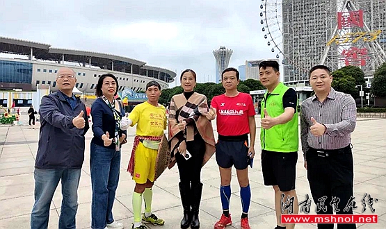 ▲邓良华到达贺龙体育广场后与陪跑团成员合影