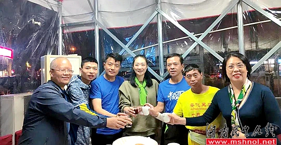 ▲“跑神”邓良华(右二)、世界冠军龚睿那(左四)与长沙市安化商会领导“干杯”