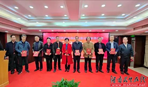 ▲益阳市人大机关二级巡视员、益阳市茶业协会换届筹备领导小组组长杨光辉(中)给顾问包小村(左)、曹文成(右)颁发聘书