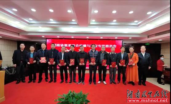 ▲湖南省黑茶商会执行会长彭接班先生给收藏与鉴定专家委员会主任肖力争教授授牌