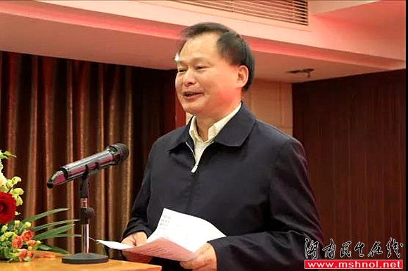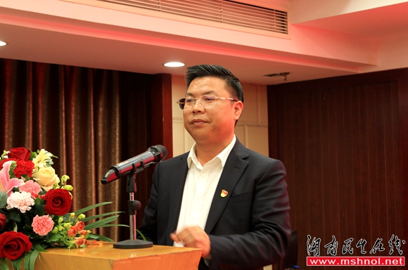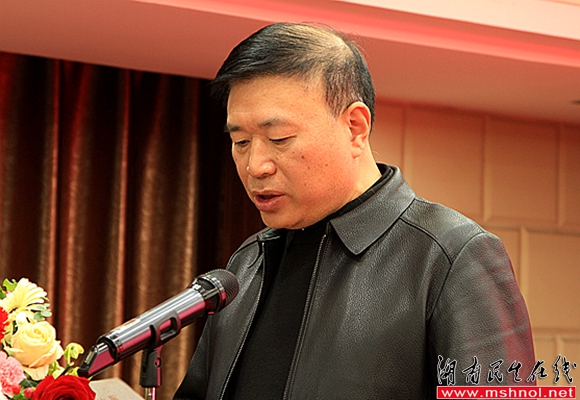 ▲益阳市人大机关二级巡视员、益阳市茶业协会换届筹备领导小组组长杨光辉讲话
