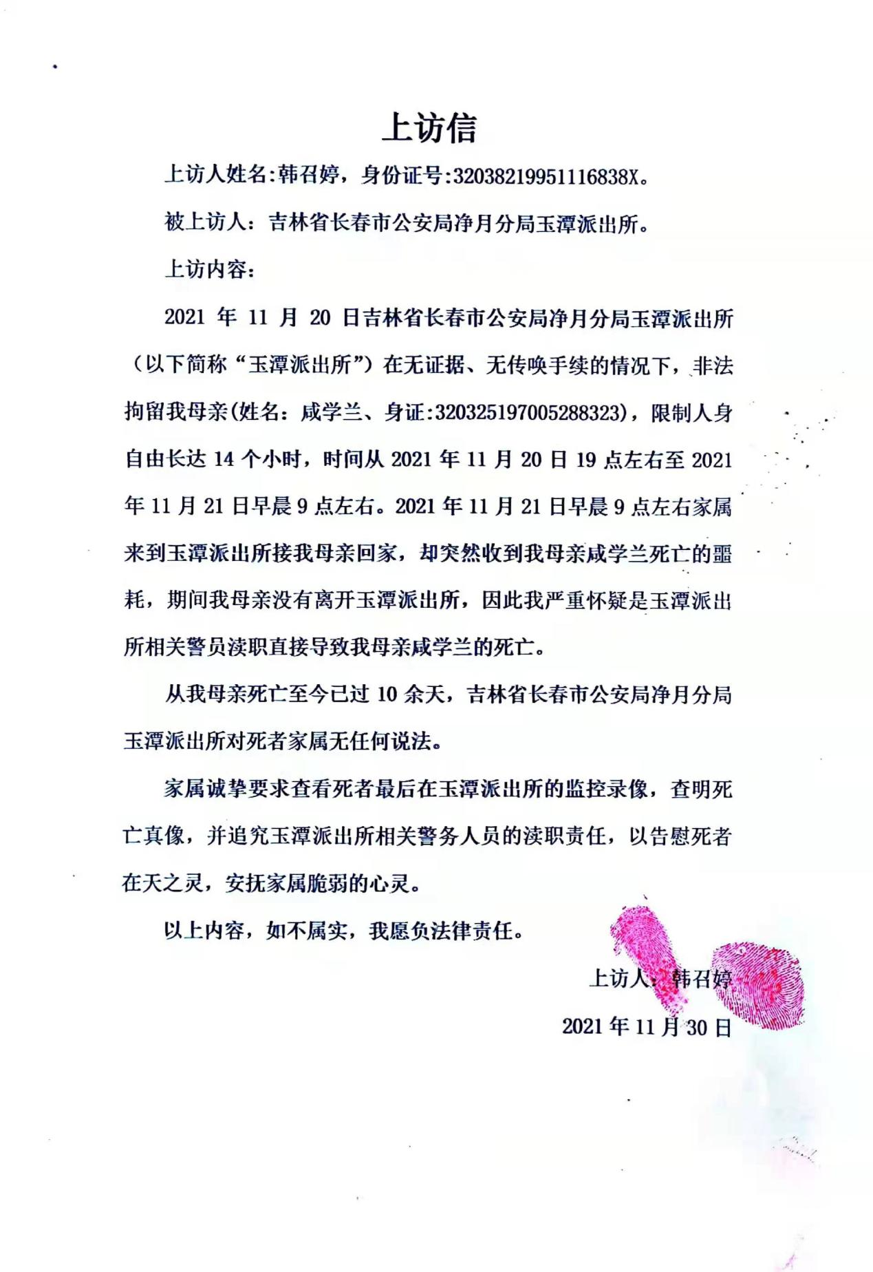 从2021年11月20日19点左右至11月21日早晨9点左右,玉潭派出所限制咸学兰人身自由长达14个小时,11月21日早晨8点30分左右,控告人来到玉潭派出所接咸学兰回家,却收到咸学兰死亡的噩耗。期间咸学兰没有离开过玉潭派出所,这14小时经历了什么能让一个鲜活的生命就这样逝去,死者家属质疑玉潭派出所相关人员对咸学兰的死亡负有直接责任。