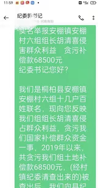 2021年7月29号,桐柏县安棚镇安棚村12名群众联名,实名举报安棚村六组组长胡某贪占青苗补偿款一案,引起了市纪委监委重视,把举报材料批转给桐柏县纪委监委。县纪委二室赵主任负责此案,并于10月22号与我们见面,见面后,赵主任说:市纪委批转来办案期为三个月,然后要求我们拿出胡组长贪污证据,当我们把村里清帐清出十一笔清单和村里公布的台帐时,纪委赵主任指着我们说你这算啥证据?你们凭啥说组长贪污?我们说这是清出来的,公布出来的,组长贪污的68500元钱己退到组会计那,这就是铁打的证据,我们要求纪委监委追究组长法律责任!作为该案件负责人,你不能压案不办,有案不立!