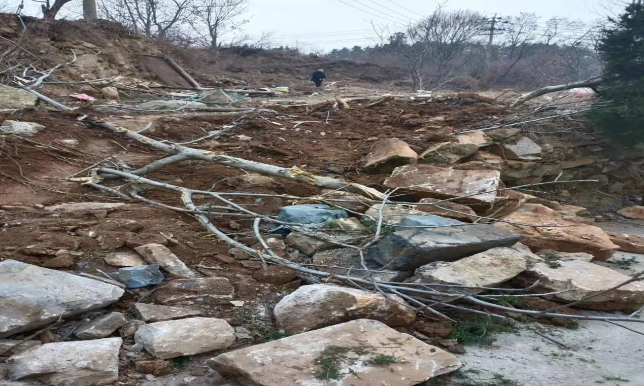 被花果山乡副书记田朝峰组织人员毁坏的林木大片倒地,一片狼藉,植被被大量损毁,耕地被大型机械严重破坏。
