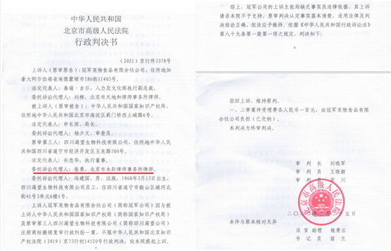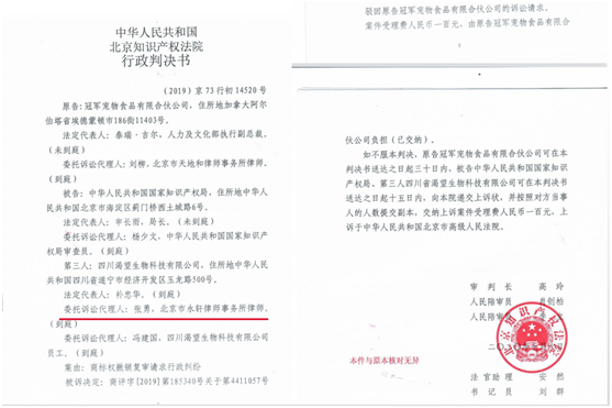 据2020年10月10日北京知识产权法院(2019)京73行初14520号《行政判决书》显示,该起“商标权撤销复审请求行政纠纷”,原告是位于加拿大阿尔伯塔省埃德蒙顿市的“冠军宠物食品公司”;被告是国家知识产权局;第三人也是“渴望”商标持有人是四川渴望生物科技有限公司;北京永轩律师事务所主任律师张勇,作为四川渴望生物科技有限公司委托代理人出庭了审理现场。