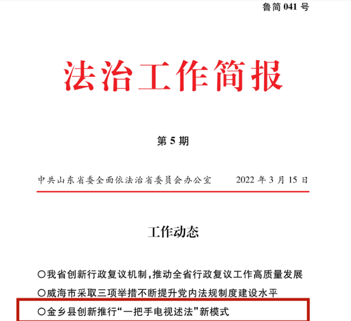 2022年初,金乡县13个镇街、16个重点执法部门的党政“一把手”轮流走进电视台演播室,坐在聚光灯下,面对镜头向全县65万人民群众进行了“电视述法”,公开接受全县人民群众对过去一年各镇街、各部门单位法治建设工作的检阅。通过电视节目公开述法,亮家底子,晒成绩单,进一步压实了“一把手”履行推进法治建设第一责任人职责。省委依法治省办《法治工作简报》第5期刊发了金乡这一典型做法。(融媒记者/ 柳桂忠 图文/杨俊文 姜超)