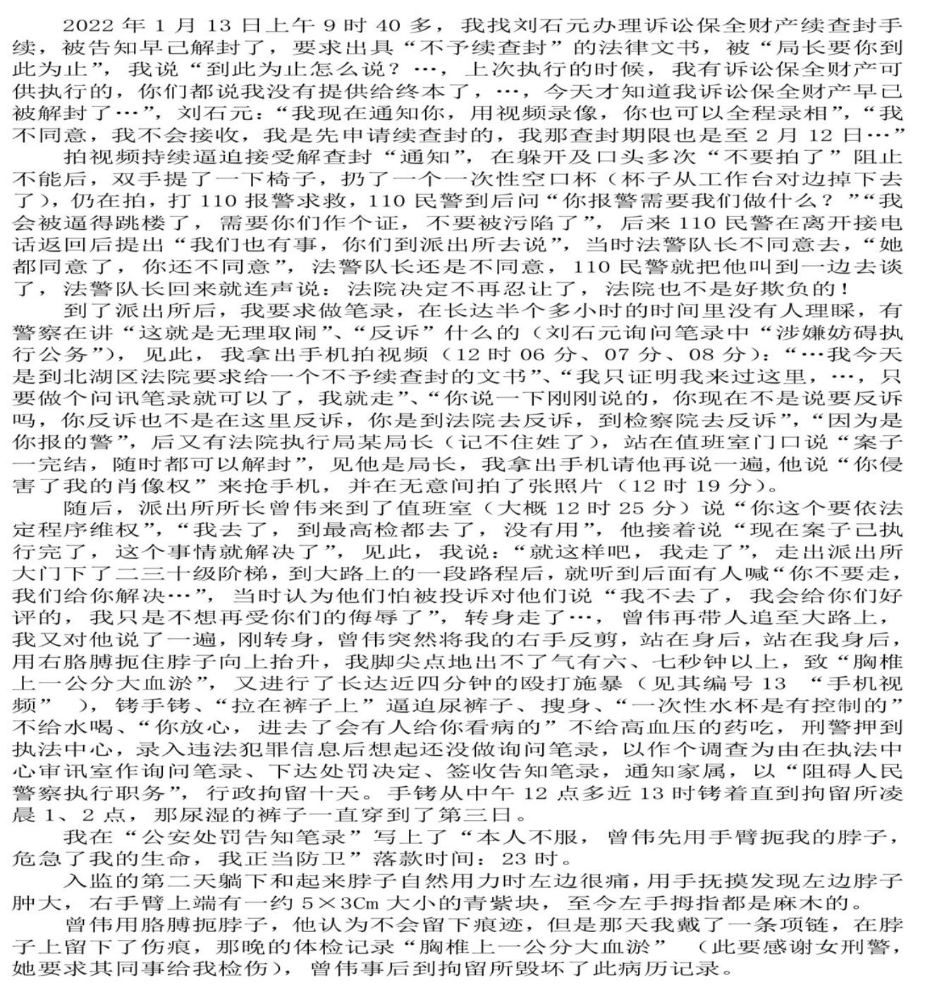 一、执行审判长王林、法官刘石元,仗着我控告无门,在违规解查封、违法终本已涉嫌犯罪下,又致我依法申请续查封不能后,联手公安,以“不满意法院判决、不执行法壕龆ǎ�…严重扰乱单位秩序”,锁喉伤命、又殴打施暴陷害制造我“罪名”、铐手铐、…、录入违法犯罪信息,以“阻碍人民警察执行职务”,伪造全案证据,将我行政拘