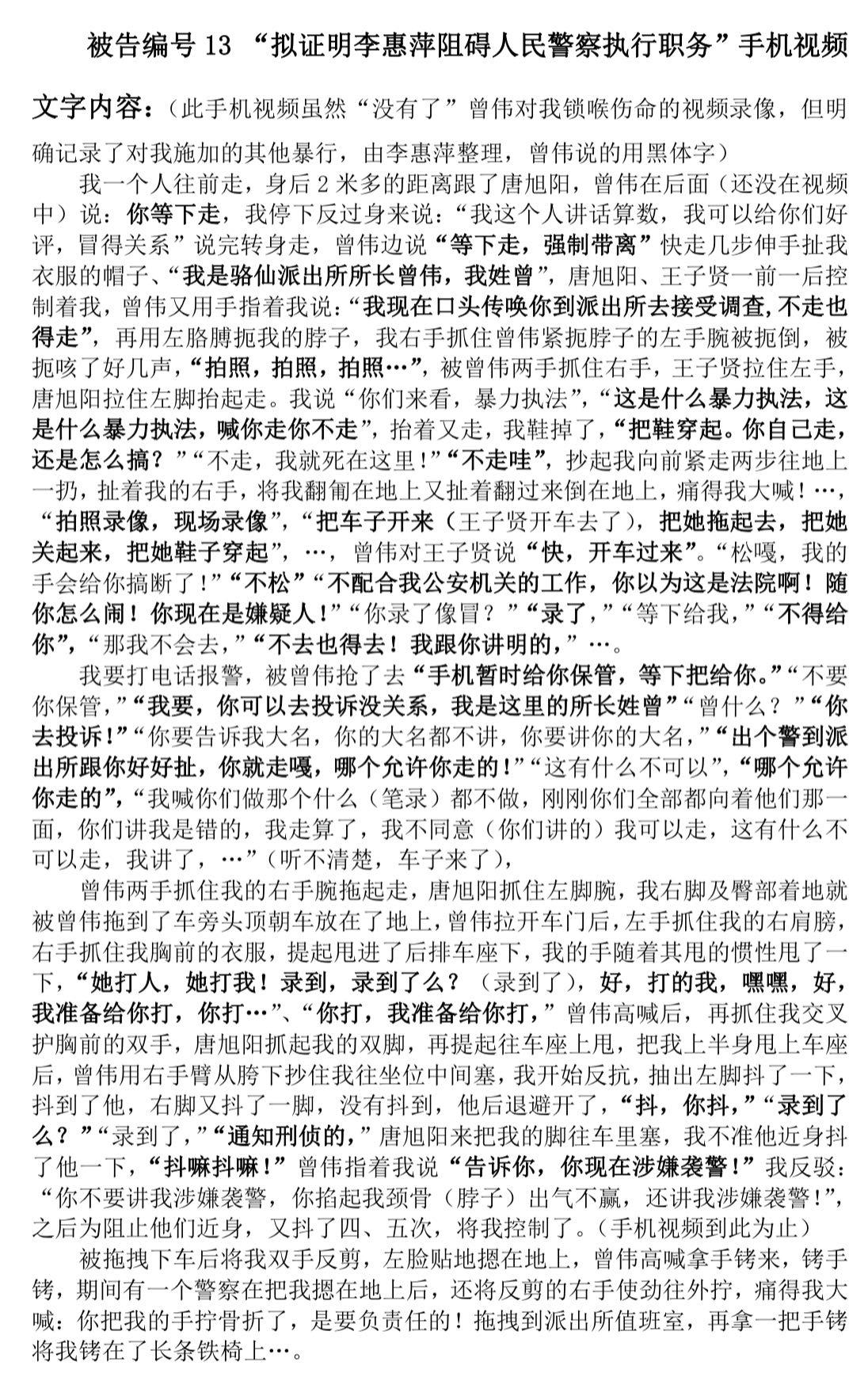 3、编号13 视频监控 “拟证明李惠萍阻碍人民警察执行职务”实为拍摄人王子贤“不小心”将自己也拍摄进了全镜中的,用手机删减曾伟锁喉伤命的录像,增加曾伟“口头强制传唤”,变造的手机视频。