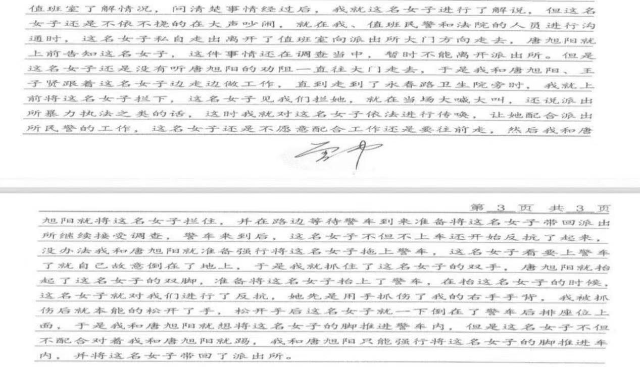 唐旭阳:收到了110指挥中心的派警,出警民警李显培带队赶往现场(在去法院的路上)。(网上查询李显培正是当天我报警后,110的出警民警,不是派出所民警。)