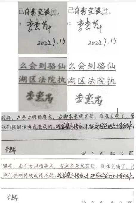 5、在收到我起诉状后,篡改我询问笔录内容与之行政行为“承认被传唤”相应,用方法将我捺印去除,将签字拓印上去,伪造捺所谓的指印(依稀可见模糊不成型),但却“忘了”在第2页“李惠萍”处及警察代手写的部分捺印。