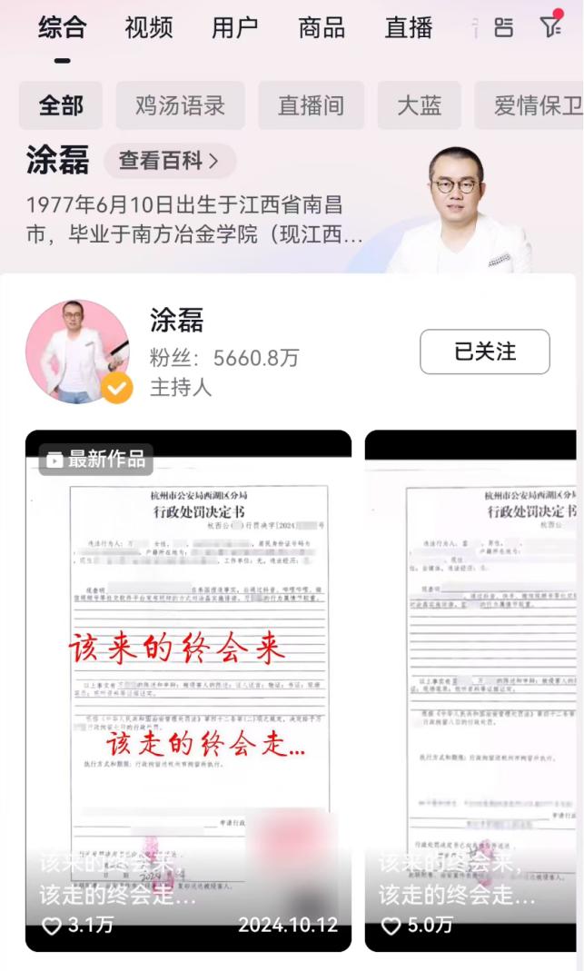 在晒出针对“大蓝”的行政处罚书的抖音上,涂磊没有过多强调自己的处境、想法,只是看似轻轻附上一句颇具感慨的话语:“该来的终会来,该走的终会走。”在被同样作为抖音大V“大蓝”诽谤后,涂磊选择了停更抖音账号两个月。早在8月份时,涂磊就曝光了自己患病住院的消息,从图片显示,涂磊面容憔悴,可见网络的暴力造谣对涂磊正常的生活工作造成了不小的伤害。