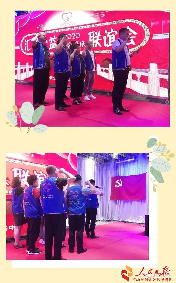 联谊晚会上,党支部负责人解昭福带领汇爱公益党支部委员王业成、赵华,管理员党员孙维蔚,汇爱公益流动党员袁以亚、王海滨、朱华玲、李佳上台,重温入党誓词。