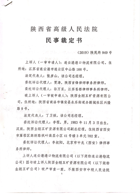 2019年3月,金刚五矿公司向陕西省镇安县人民法院申请破产,该院审查后作出(2019)陕1025破申1号《民事裁定书》,裁定不予受理。金刚五矿公司不服,向商洛市中级人民法院上诉,该院作出(2019)陕10破民终1号《民事裁定书》,驳回上诉。