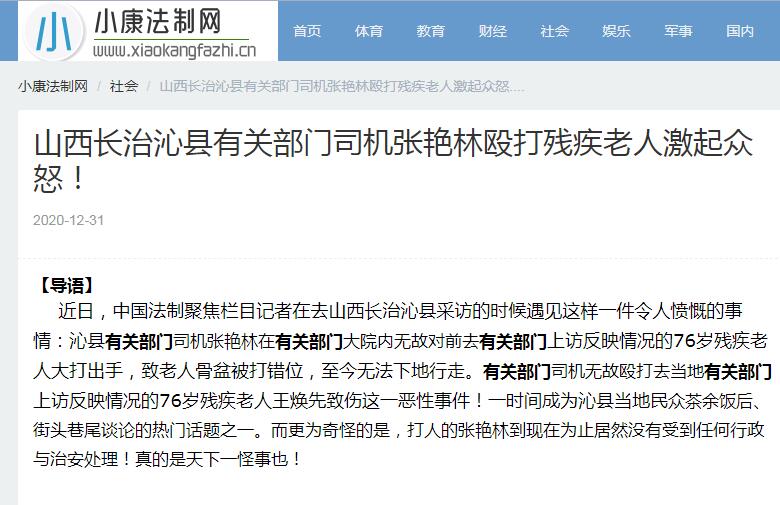 【正文】据了解:2020年9月22日上午8时左右,山西省长治市沁县段柳乡良村76岁残疾村民王焕先老人独自一人去沁县有关部门就她丈夫十年前无缘无故被邻居温月英殴打致伤、致死一事依法进行维权。在去沁县有关部门饭厅找张局长的时候,被身高体壮给张局长开车的司机张艳林拦在门口不让进去,并口出恶言的威胁老人说:“也不看看这是什么地方,这地方也是你老太太来的地方吗?”。说完,他便无任何理由的上去挥拳动手卡住残疾老人王焕先的胳膊,并对老人家一阵疯狂殴打,过后,他还觉得打的不解恨、不过瘾,又将老人家摔倒在地上进行长时间的殴打,在老人被打的卷缩在一起无法反抗的情况下,他竟然还用脚连续踢了被他打倒在地上动弹不得的老人数下,然后是【潇洒】的扬长而去。后在保安的搀扶下,老人才得以从地上艰难的爬起来。在围观众人的帮助下,老人家在沁县有关部门找到了沁县张局长并将她在县有关部门被他司机殴打的情况说了一下,在得知详情以后,当即,张局长打电话要他的司机张艳林过来给老人家赔礼道歉,态度强硬的张艳林不但没有向老人家道歉,还处处耍赖、耍横,就是不肯就打人事情认错,后来,张局长让有关部门派车子将老人送到沁县东街口。下车后,无故被打的老人家不服,便拖着被打伤的身体去沁县信访局就自己无辜遭到有关部门司机殴打一事进行上访,接待她的沁县信访局工作人员要她先去医院接受治疗再说,经沁县人民医院值班医生初步诊断与CT检查结果显示:老人家的骨盆已经被张艳林殴打错位,需住院接受治疗。后来又不知道是怎么回事,医生突然又改口称她的这个伤不是新伤,是旧伤,无需住院接受治疗。为了慎重起见,行走困难的老人家在他人的搀扶下,又去了沁县中医院进行伤情复查,检查结果依然是一样:旧伤。没办法,老人家只能够是在他人的帮助下,买点儿药水自己回家给自己保守治疗了。据沁县有关部门内部知情人告诉我们说,张艳林依仗他一直是跟局长开车子,平时在局里就处处横行霸道,流氓成性,是出了名没有人敢惹的一个臭名昭著的主儿。就在当天老人被打伤去医院检查期间,他还多次口出狂言的威胁被他殴打受伤的老人不许去任何哪家医院检查住院治疗,否则,他将对老人不客气。