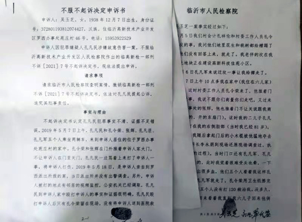 吴老太不服当地检察机关的“不予起诉决定”向临沂市人民检察院提出申诉。申诉书称,2019年5月7日上午,孔凡民和孔令荣、张辉、孔凡臣、孔凡军五人乘坐两辆车来到申诉人(吴玉芝)居住的位于临沂市罗西办事处苑庄村的家中。孔令荣和张辉在门外推着大门不让申诉人关门,孔凡民一边骂着上来打了申诉人一拳,将申诉人打伤。2019年5月18日,是申诉人亲自到罗西派出所报的案,当日派出所并没有出警调查。另外,申诉人被打的地点有邻居的视频监控,公安机关已调取,孔凡民到申诉人家中殴打申诉人的事实和证据很明确。孔凡民殴打申诉人后只有孔令荣在现场,没有将申诉人送到医院救治。该案在近两年的处理过程中,高新区公安机关和检察院多次主张调解处理。