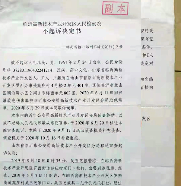 2019年7月3日,临沂市公安局高新技术产业开发区分局认为“符合立案条件,现立案侦查”,10月17日,吴玉芝签收了“受案回执”及“立案告知书”。2020年6月11日,孔凡民因涉嫌故意伤害罪被临沂市公安局高新技术产业开发区分局取保候审;2020年6月29日被临沂高新技术产业开发区人民检察院取保候审。