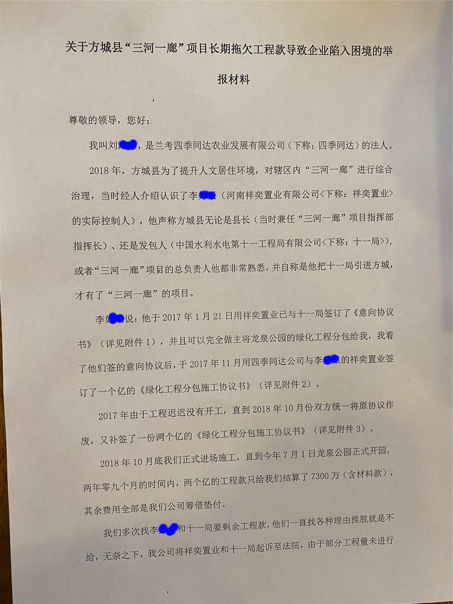 2018年,方城县为了提升人文居住环境,对辖区内“三河一廊”进行综合治理,当时经人介绍认识了李XX(河南祥奕置业有限公司<下称:祥奕置业>的实际控制人),他声称方城县无论是县长(当时兼任“三河一廊”项目指挥部指挥长)、还是发包人(中国水利水电第十一工程局有限公司<下称:十一局>),或者“三河一廊”项目的总负责人他都非常熟悉,并自称是他把十一局引进方城,才有了“三河一廊”的项目。
