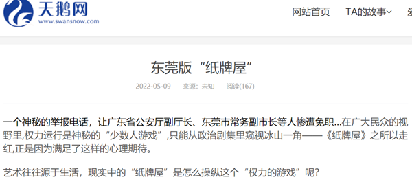 一个神秘的举报电话,让广东省公安厅副厅长、东莞市常务副市长等人惨遭免职…在广大民众的视野里,权力运行是神秘的“少数人游戏”,只能从政治剧集里窥视冰山一角——《纸牌屋》之所以走红,正是因为满足了这样的心理期待。