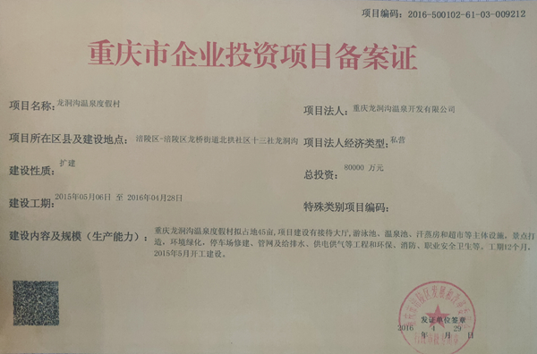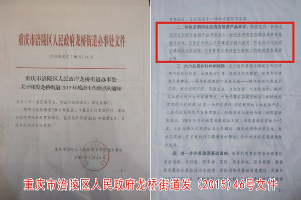 2015月3月16日,涪陵区政府龙桥街道办事处出具红头文件,龙桥街道发[2015]46号红头文件,文件内容第二条明确说明:“加快龙洞沟生态酒店旅游产品开发,积极支持,鼓励龙洞沟生态酒店旅游产品开发投入,加快龙洞沟生态酒店旅游设施建设步伐,力争在2015年上半年建成并投入使用,把龙洞沟生态酒店建设成为涪陵乃至重庆具有特色和影响力的休闲度假旅游品牌”。龙洞沟生态酒店当时还被重庆市评为五星级乡村洒店。