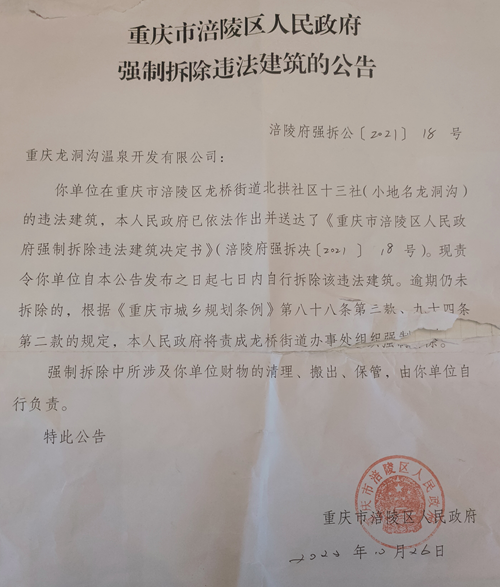 从2020年开始,涪陵区城管局又向龙洞沟温泉城企业发出一系列文书,包括:限拆违章通知、决定、公告,但时至今日没有任何一个部门和工作人员与投诉人协商拆迁事宜。2022年10月26日,涪陵区政府指派龙桥街道办理处和城市管理执法大队在温泉城门口张帖了强拆公告,限期七天之内自行拆除,否则责成龙桥办事处强制拆除。同日,相关部门在未经企业知晓和同意的情况下,擅自闯入企业内部拍照并驱赶员工,并且政府协同水电气部门通知企业将要被停电、停气、停水。
