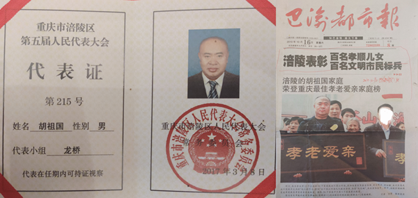 胡祖囯,男,现年51岁,中共党员,曾任社区党委书记,涪陵区两届人大代表,重庆市人民检察院人民监督员,重庆市最佳孝老爱亲家庭获得者,重庆市两新组织优秀共产党员,涪陵区优秀共产党员,涪陵区关工委先进个人,重庆市司法局优秀人民监督员,涪陵区十佳返乡创业明星,涪陵区创业明星,涪陵龙桥街道优秀党务工作者,助力脱贫功坚荣誉称号,涪陵区政府十星级农户标兵。