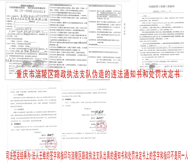企业法人、股东、家庭受到各种打圧后,他们通过信访途径反映问题,龙桥政府街道岀据了龙信访函字[2018]33号,明确了温泉城纳入拆迁范围,等到的结果却是2019年4月30日在温泉城大门张贴的一份重庆市涪陵区路政执法支队的强拆通知,支队于2015年4月13日作出的涪路罚[2015]7号处罚决定书,进行强制拆迁,但是根据股东胡祖国、法人王维描述,涪路罚[2015]7号处罚决定书的原始调查笔录内容法人王维签字和指印全系伪造,并且有司法鉴定书为佐证。
