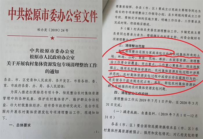 据了解,松原市委、市人民政府于2019年发布的《关于开展农村集体资源发包专项清理整治工作的通知》(“松办发【2019】24号”),是为了推进打黑除恶专项斗争,彻底整治农村集体资源管理中的各种乱象,保护农村集体资产,维护群众合法权益而制定的。总体要求是清理整治工作,按照聚焦重点,依法处置,强化责任,确保稳定的要求,全面清查违法违规侵占农村集体资源行为,严厉打击农村集体资源发包背后的黑恶势力及其保护伞,整顿群众身边的腐败问题。清理整治范围为家庭承包以外的农村集体所有的土地、林地、山岭、草原、荒地、滩涂、水面等资源。欧力岗村一社村民的0.8亩土地属于家庭承包以内的土地,是当年村委会为了“少交农业税”而遗留的问题。2017年12月,欧力岗村委会又和社员签订过补充协议,协议条款明确约定“欧力岗村同意五家户没有确上权属的耕地经营权在有效承包期限内(与确权地同期结束)永久归五家户社员耕种”。“1998年二轮土地承包时,我们依法预留了5%耕地作为机动地,村里要动的也只能是这个预留地,每个人口0.8亩土地是当年按照人口统一分配的,村里没有资格拍卖”,社员们说。