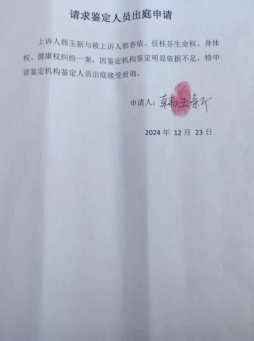 接受媒体采访时,韩玉新满腹委屈,他说:“一审过程中,法院并未将赤峰学院附属医院司法鉴定中心终止鉴定的情况告知于我,也没有告知委托天津天意司法鉴定所进行了第二次鉴定的相关事项,我是在收到判决书后才得知此事。同时我也咨询了相关的医学专家并查阅了很多资料,正中神经分布的部位应该在手臂内侧而不是郭香依受伤的手臂外侧,因此郭香依要求为其鉴定正中神经损伤的要求被赤峰当地的鉴定中心拒绝而终止鉴定。对于司法鉴定所出具的鉴定结果,我充满质疑,2024年12月23日,在二审过程中,我向法院提出请求鉴定人员出庭申请,也未得到支持。”