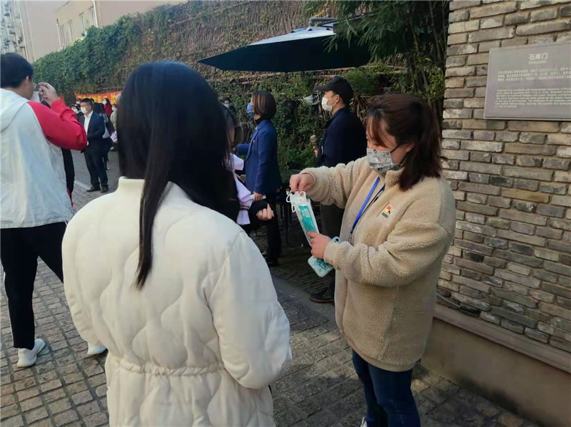 西岸别院工作人员在各楼层人员全部到达广场后,要求大家戴好口罩,每人领取一条毛巾。