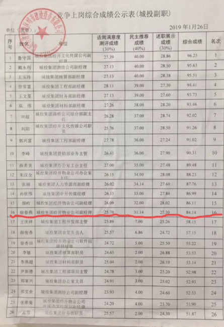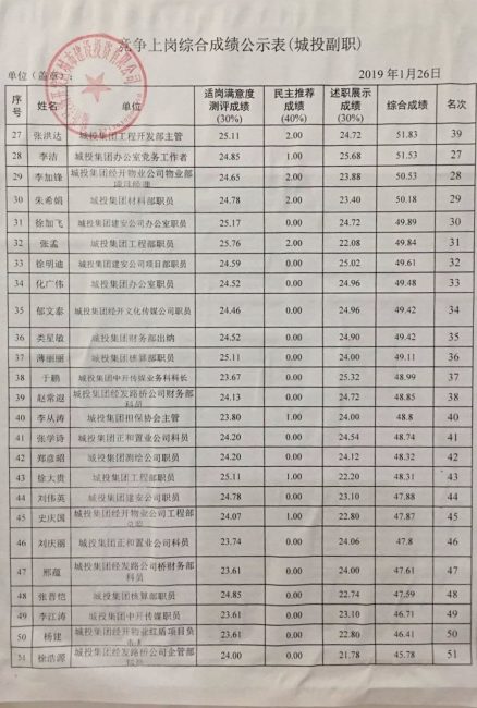 根据该员工提供的2019年1月26日临沂市经开区城投集团副职竞争上岗公示表显示:在这次城投副职竞争过程中,所有竞聘人员的综合成绩是按照适岗满意度测评成绩占30%、民主推荐占40%、述职展示成绩占30%,加起来综合成绩排名。令人感到蹊跷的是,一共54名中层参加竞聘,在公示表的前16名内,这些人的民主推荐占、述职展示成绩均比16名以后的38人都高,尤其是民主推荐成绩,从第16名的31.14,突然就降到17名的7分,越往后为零分。