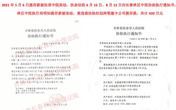 正当德卡公司以为马上要收回垫付款时,扶余市自然资源局对德卡公司提起了诉讼,要求德卡给付所谓的土地增容费和滞纳金,德卡公司认为此案件是典型的虚假诉讼。但该局随即就向松原中院申请保全,冻结了德卡公司在林区中院的提存款,松原中院2021年5月6日作出(2021)吉07民初6号民事裁定书,5月7日向林区中院送达了(2021)吉07民初6号执行裁定和协助执行通知书。林区中院执行一处处长何海凤,受该院执行局长闫莉主使,在冻结的提存款没有解封的情况下,违规将扶余市法院6月16日邮寄的(2021)吉0781执58-2号、59-2号、(2021)吉0781执行1号之三协助执行通知书涉及的案款协助扣划两笔,一笔180万元、一笔240万元,扣划德卡公司提存款总计达420万元。德卡公司认为,该两起案件存在巨大争议,同类案件共计15起,德卡公司已经胜诉13起,仅两起败诉,因一二审法院明显同案不同判,该公司正在申诉,通过法律途径维护权益,林区中院在此时划走该公司420万元属于违规操作。