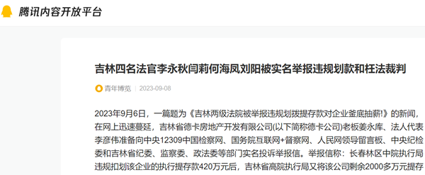 2023年9月6日,一篇题为《吉林两级法院被举报违规划拨提存款对企业釜底抽薪!》的新闻,在网上迅速蔓延,吉林省德卡房地产开发有限公司(以下简称德卡公司)老板姜永库、法人代表李彦伟准备向中央12309中国检察网、国务院互联网+督察网、人民网领导留言板、中央纪检委和吉林省纪委、监察委、政法委等部门实名投诉举报信。举报信称:长春林区中院执行局违规扣划该企业的执行提存款420万元后,吉林省高院执行局又将该公司剩余2000多万元提存款打回松原中院,致使该企业赢了官司却拿不到钱,处境艰危,濒临倒闭。他们不解,在全国上下都在大力促进民营企业发展的大背景下,省高院执行局长李永秋、长春林区中院执行局局长闫莉及林区中院执行一处何海凤和省高院民一庭刘阳四位法官为什么如此坑害企业,非要置企业于死地!