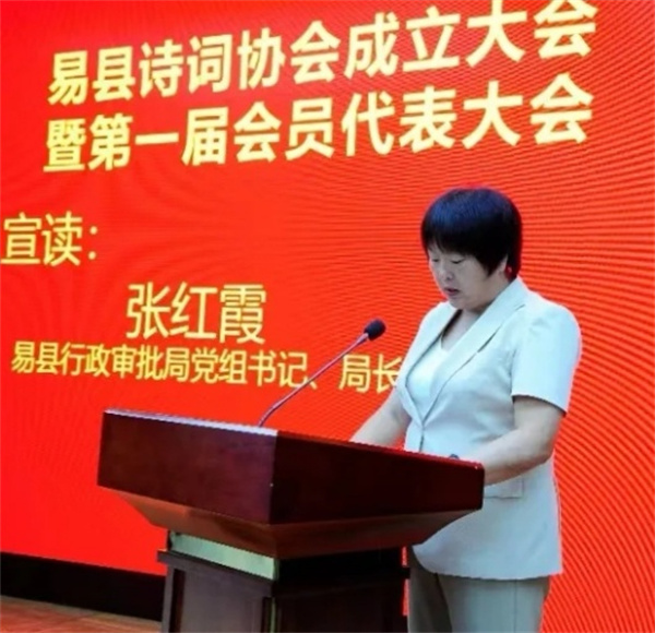易县行政审批局局长张红霞宣读《关于准予成立易县诗词协会成立的决定书》。