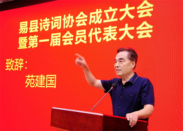 易县籍原总参兵种部大校、军旅书法家、诗人苑建国致辞。他说:易县有诗有故事有历史,易县诗词协会的成立,必将成为千年古县的一道新的靓丽风景线。