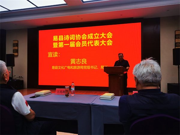 易县文化广电和旅游局局长黄志良宣读《易县文化广电和旅游局关于同意易县诗词协会成立登记并作为其业务主管单位的函》。