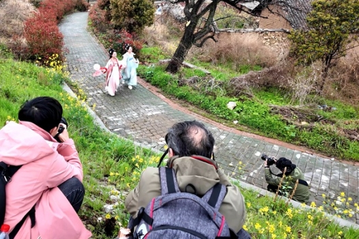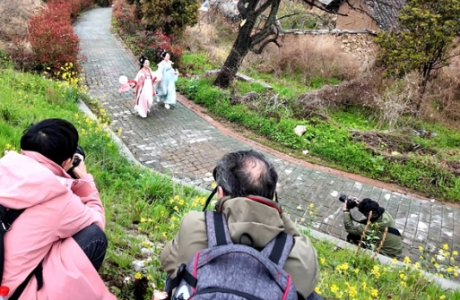 在这个花季,身着传统汉服的美女也会来到这里,踏春赏花,增添了浓厚的古典风情。