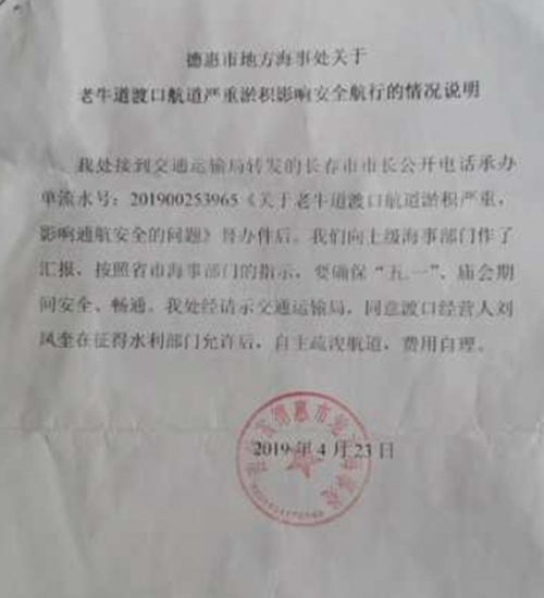 记者联系了一大圈,最终也没有搞清楚老牛道渡口清淤或航道疏浚究竟归哪个部门管,相信当地的大多数村民们更搞不清楚了。刘凤奎再次被刑拘前曾经告诉记者,自打他爷爷那辈人起,就在这个老牛道渡口上给人摆渡,从来没遇到过多大的难事儿。但是,到了现在,老牛道清淤似乎成了天大的难事了!经过调查走访,记者感到,老牛道渡口淤堵问题,要想解决其实并不复杂,那些管事的头头们亲自到现场看看不就结了?为什么竟能如此之难呢?从德惠市地方海事处2019年4月23日做出的《情况说明》中,我们看到,此事还是有人管的。我们真诚的期望德惠市政府和有关部门腾出一点时间,到现场调查一下,认真解决好“老牛道”渡口淤堵问题。因为,老牛道渡口虽然是刘凤奎在经营,可是这个渡口关系到很多村民和学生的切身利益,也关系到当地的水运经济,当地政府应该早日采取措施解决其通航问题。也许老百姓说的话有些道理:假如那些管事儿的部门头头们、政府头头们的孩子们、家人们需要来往于松花江两岸去求学、做生意的话,老牛道渡口淤堵恐怕早就不是问题了。
