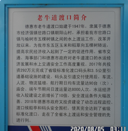 从这个简介来看,老牛道渡口还是很重要的:一,她承担着岔路口镇与榆树市五棵树镇之间的水上渡运工作,“为我市东五区玉米和稻草向五棵树转运,提高农民经济收入起到了一定的促进作用。”二,当地政府“2017年共投资292万元完成了省级标准化渡口码头和3.5公里引道基础设施的建设。”三,“码头及引道交付使用后,车流、人流、物流猛增,航行期日均车流量达90台(次),庙会、端午节期间,日渡运量达8000人次,水运经济收入较建设之前增长了10倍,安全渡运条件大幅改善”。四,该渡口的水平“完全达到了省级标准化渡口,走在了全省水上渡运和安全管理的先进行列。”