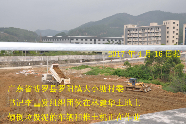 其二,2017年4月16日,以大小塘村现任支书李某发为首组织团伙成员驾驶重型孖担车,其中一辆为赣K18076和另一辆赣CJ8085及一辆大型推土机,由一名驾驶粤LVR383小轿车指挥撞毁聚有公司围墙,然后在聚有公司空地上倾倒填埋垃圾和建筑废料。该过程被公司发现时立即报警,警察到场制止了以上涉案车辆,并拍照取证。