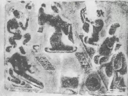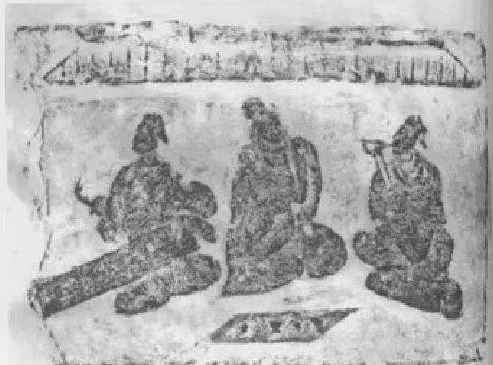*图上三人,左一人鼓瑟,右一人吹笙,中间一人抚耳静听。三人面前一案,上有耳杯。